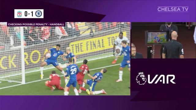 回到事发现场,红军压着蓝军禁区猛攻,连续多次形成射门,皮球从左侧立柱反弹到右侧马内脚下,塞内加尔人顺势推射,皮球被站在门线上的里斯·詹姆斯挡出。就在里斯·詹姆斯解围的同时,至少有4名利物浦球员举手示意手球。泰勒并未在第一时间做出判罚,而是示意自己在等待视频助理裁判的决定。得到提示之后,泰勒回到场边观看慢镜头,但只看了一眼回放,泰勒就跑回了场内,手指点球点同时,也向詹姆斯出示了红牌。这一判罚引发了在场蓝军众将的怒火,上前抗议判罚的吕迪格也因此染黄。萨拉赫点球破门之后,双方球员再次发生了冲突。亨德森试图去拿球,但门迪一脚将球踢在了亨德森的身上,球员们又挤成一团,最终肇事的门迪也被出示黄牌。